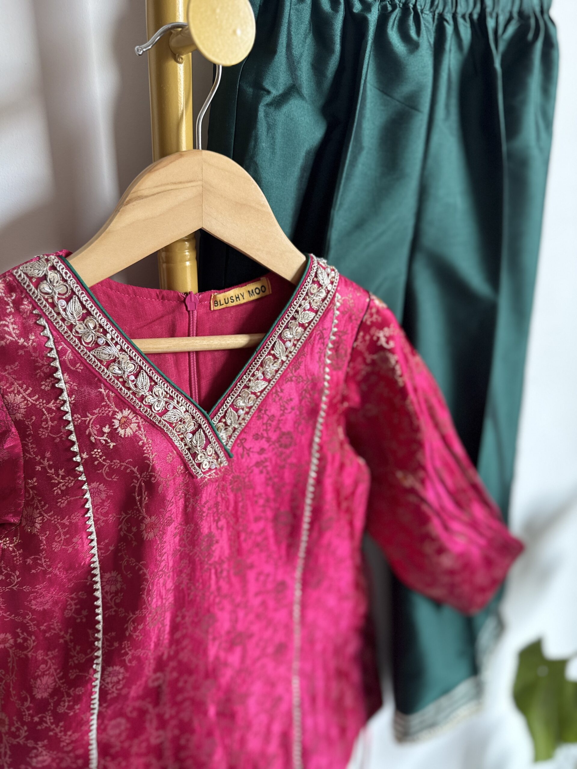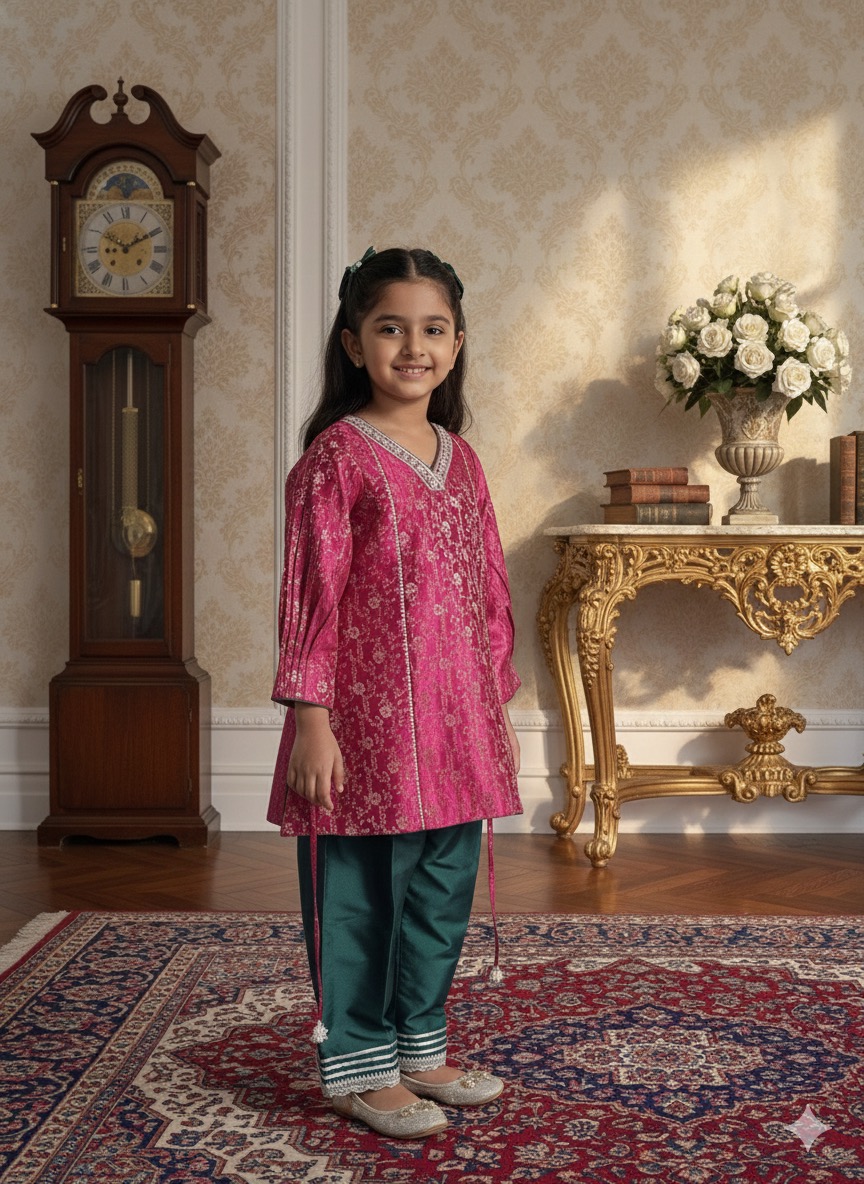 A radiant MAGENTA pink silk kurta with delicate zari vines and soft handwork. Paired with rich silk bottoms for a regal winter charm.