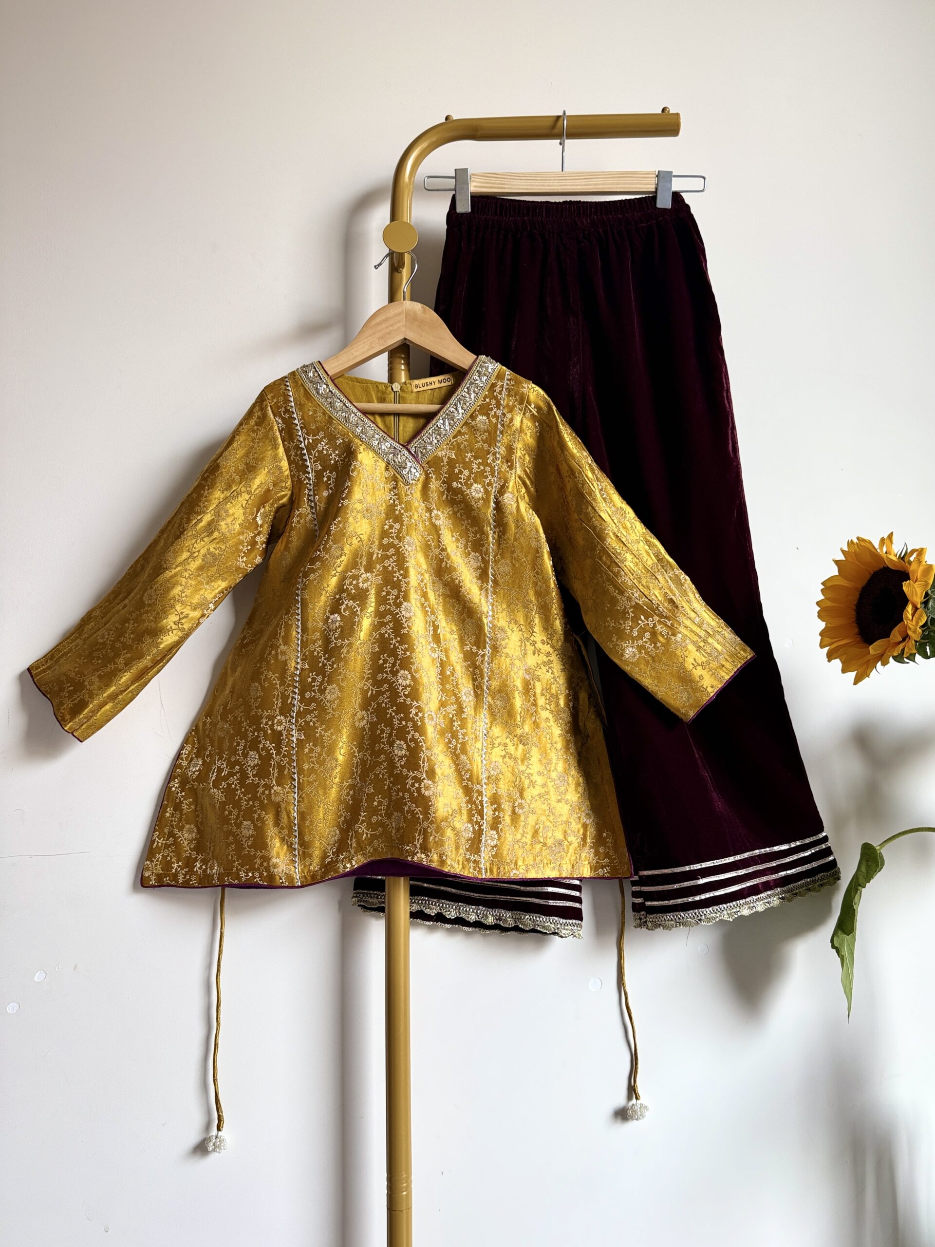 A radiant GOLD MUSTARD silk kurta with delicate zari vines and soft handwork. Paired with rich velvet bottoms for a regal winter charm.