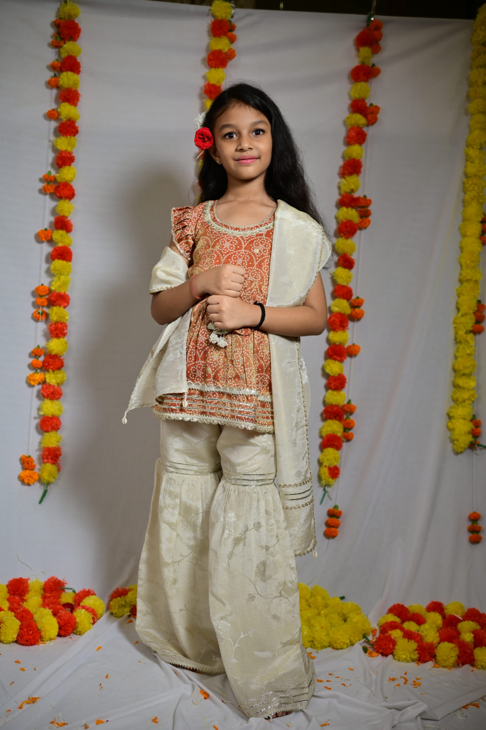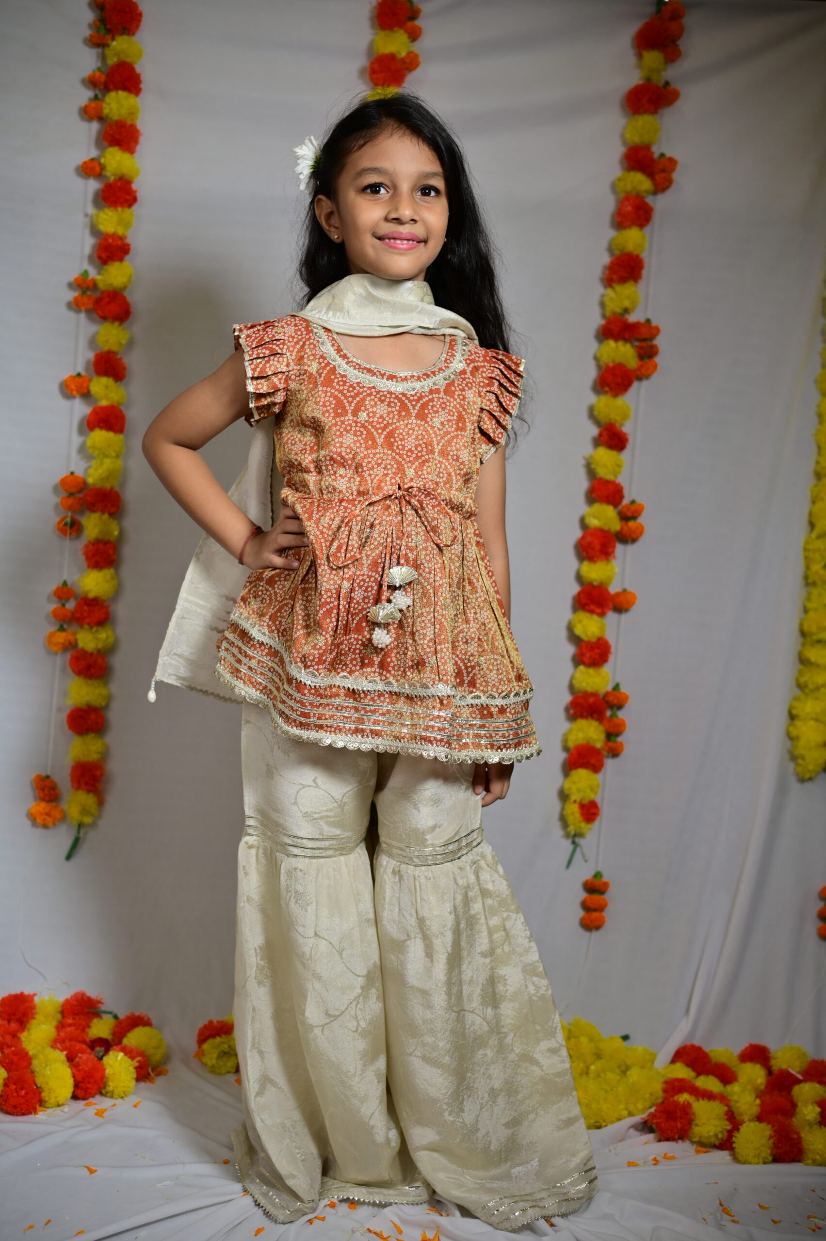 This outfit has a rust orange bandhani print top with frills on the shoulders and scalloped lace at the edges. It is paired with a beige tissue silk sharara that has intricate detailing, along with a matching dupatta to complete the look. The whole set is lined with cotton fabric for comfort.